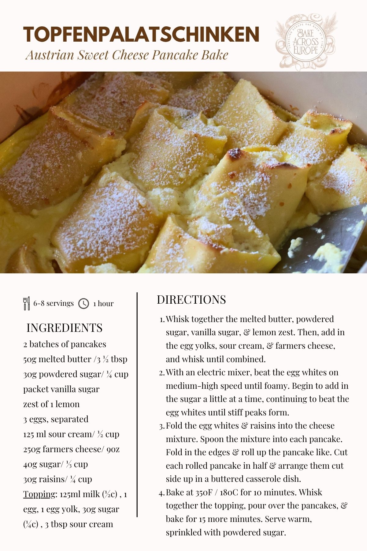 Once the filling is made, you just smear it on the pancakes, roll them up, slice them in half, and nestle them cut side up into a casserole dish. They bake for a bit, and then you pour over a mix of eggs, sour cream, sugar, and milk. It all bakes together into something warm, creamy, and incredibly comforting. This is the kind of food Oma would serve you, the kind that lingers in your memory long into adulthood.