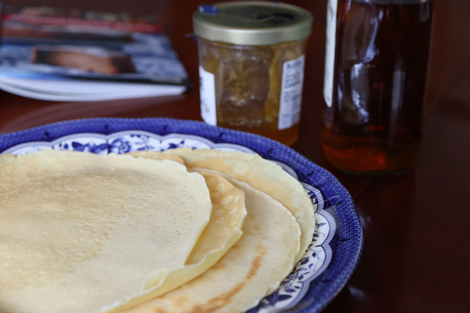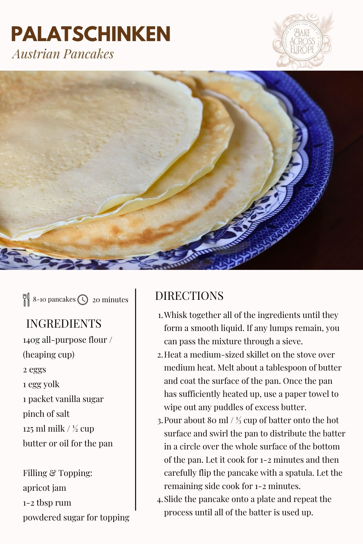 I chose Palatschinken, the Austrian version of pancakes. The book suggests two classic fillings: apricot jam and sweet cheese.