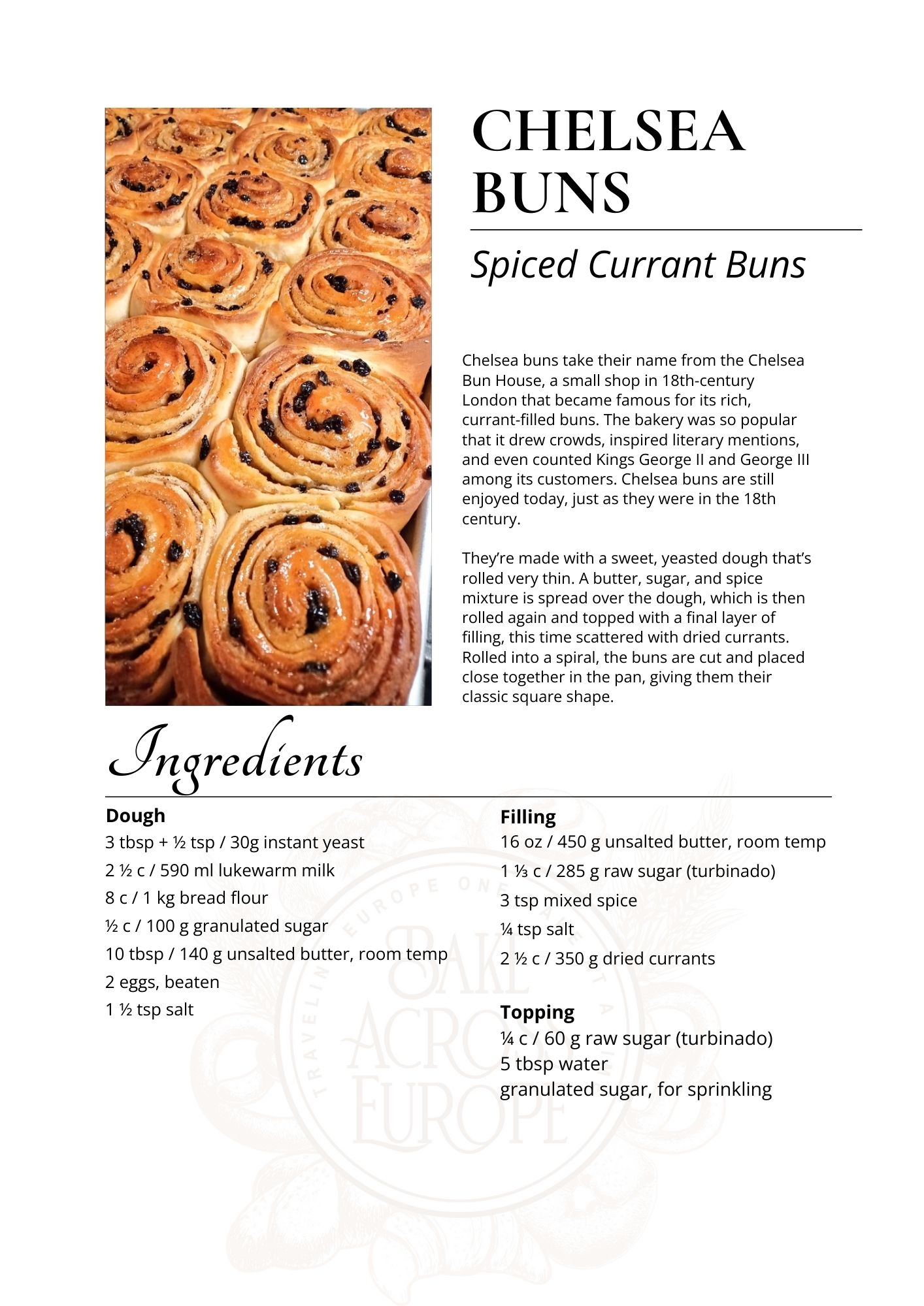 Chelsea buns take their name from the Chelsea Bun House, a small shop in 18th-century London that became famous for its rich, currant-filled buns. The bakery was so popular that it drew crowds, inspired literary mentions, and even counted Kings George II and George III among its customers. Chelsea buns are still enjoyed today, just as they were in the 18th century.