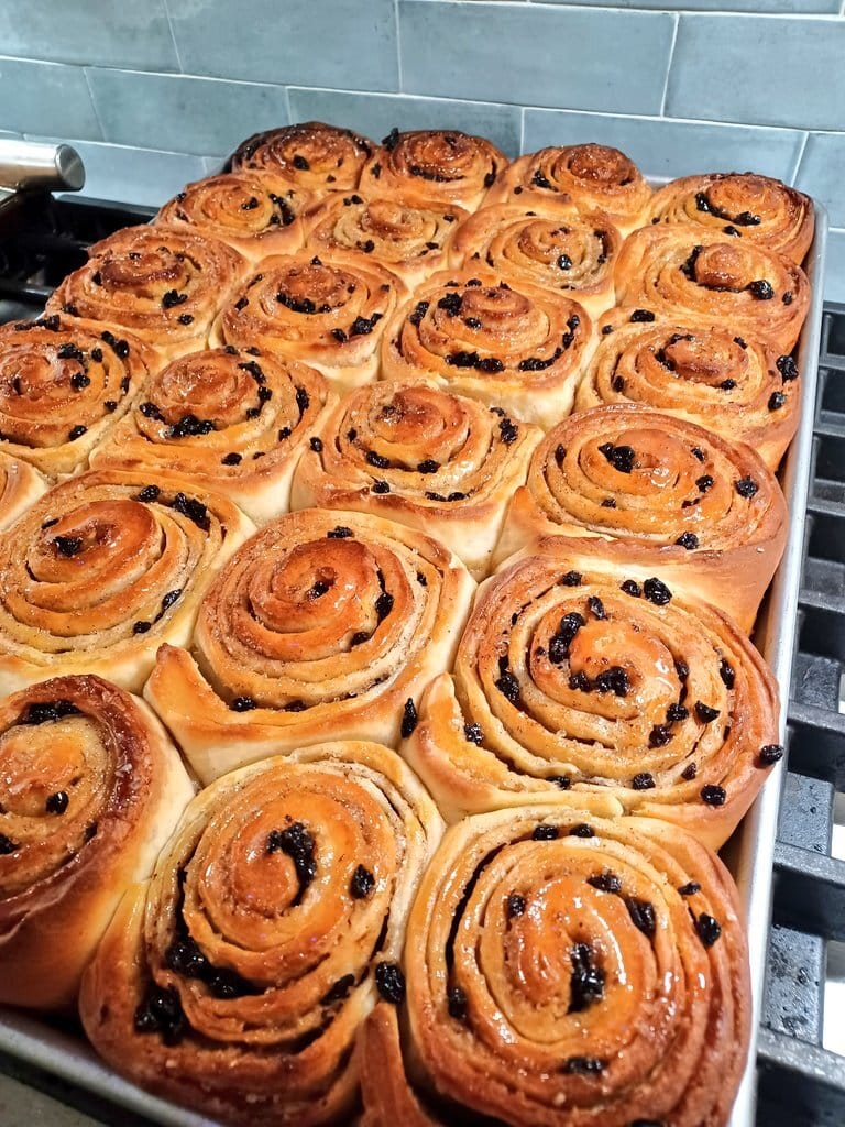 They’re made with a sweet, yeasted dough that’s rolled very thin. A butter, sugar, and spice mixture is spread over the dough, which is then rolled again and topped with a final layer of filling, this time scattered with dried currants. Rolled into a spiral, the buns are cut and placed close together in the pan, giving them their classic square shape.