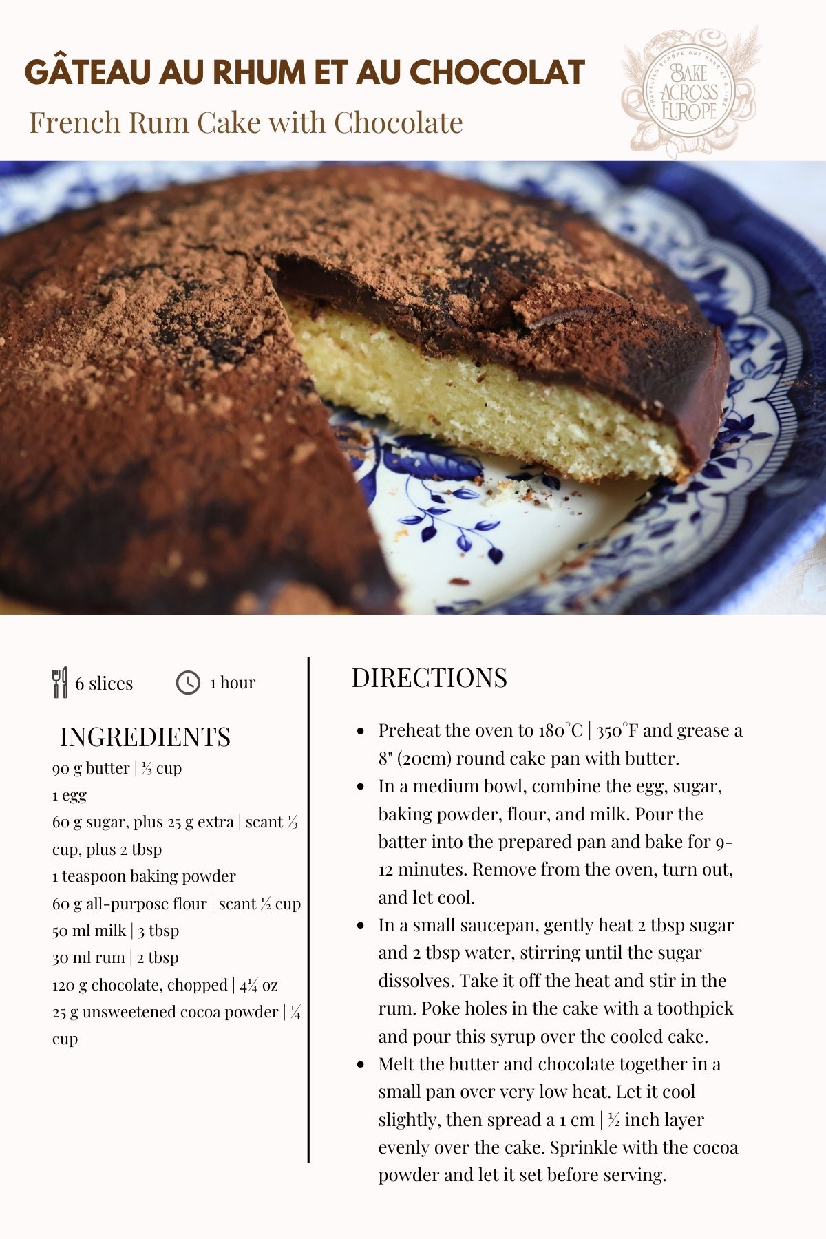There’s a hefty dessert and baking section—some recipes elaborate and others very simple. This week I chose a simple chocolate rum cake because, as I’ve said before, I need my recipes to be simple mid week. I was intrigued by this recipe because it is not actually a chocolate cake, but rather a rum-soaked sponge with chocolate spread on top.